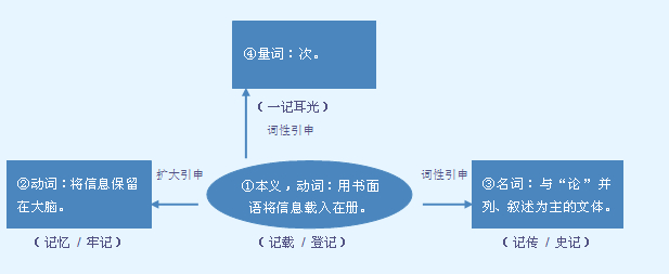 释义 | ![]() 把印象保持在脑子里: 博闻强~|我~不清楚了|这些生词都应~住|我的话你要~在脑子里,可不要忘了。 忘 wàng ~乎所以|得意~形|这事你别~了|他早把那事~得一干二净了。 对事物的印象保存不忘;把事物记载、记录下来。能重叠。可作带宾、带补谓语,也可构成连动词组作谓语。 学外语的人应该多~一些单词|我还~着他的诺言呢!|这次战役结束后,上级给一连~了集体二等功|上课的时候他不太用心,偶尔~~笔记|大病以后她什么事都~不住了|我把老陈的电话号码~在采访簿里|几十年前的事情妈妈还~得清清楚楚|我没有~下她的地址|初中学过的乘法公式他都还~着没忘|下午你~着再提醒我一声。 ❶记载、描写事物的书或文章。一般不单独出现,往往是在它前面加上限制成分构成偏正词组后作书名或篇名。也常用作语素构成合成词。 《史~》|《西行漫~》|《木偶奇遇~》|《永州八~》|《醉翁亭~》|《观巴黎油画~》|日~|笔~|游~。 ❷标记;记号。 【反】 〈动〉忘 【词语】 记分 记工 记功 记挂 记过 记号 记恨 记名 记取 记事 记述 记诵 记叙 记叙文 记账 记者 字源解说 己,既是声旁也是形旁,是“纪”的本字,表示用以打结、记事的绳子。记,金文 ![]() ![]() ![]() ![]() ![]() ![]() ![]() 附 文言版《説文解字》:記,疏也。从言,己聲。 附 白话版《说文解字》:记,标注。字形采用“言”作边旁,采用“已”作声旁。 引申线索 ![]() 【字族索引】 己 【同音字】 jì |
