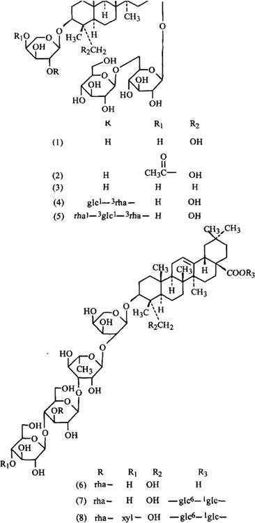 释义 | 续断 【名称出处】:《本经》 【概况】: 异名 龙豆、属折(《本经》),接骨、南草(《别录》),接骨草(《卫生易简方》),川断(《临证指南》),鼓槌草、和尚头(《滇南本草》)。 基源 为川续断科川续断属植物川续断或日本续断的根。 原植物 川续断Dipsacus asperoides C.Y.Chen ex T.M.Ai(Dipsacus asper auct.non Wall.)。日本续断Dipsacus jjaponicus Miq. 历史 续断始载于《本经》。历代本草收载甚为混乱,如李时珍曰:“李当之、范汪并言是虎蓟,日华子言是大蓟,一名山牛蒡。苏恭、苏颂皆言叶似苎麻,根似大蓟。而《别录》复出大小蓟条,颇难依据。但自汉以来,皆以大蓟为续断,相承久矣。究其实,则二苏所云似与桐君相符,当以为正。 今人所用以川中来,色赤而瘦,折之有烟尘者良焉。 郑樵通志谓范汪所说乃南续断,不知何据?盖以别川续断耳。”《滇南本草》谓:“续断一名鼓槌草,又名和尚头。独苗对叶,苗上开花似槌。 ”在《植物名实图考》载:“今滇中生一种续断,根似芥菜,亦多刺,与大蓟微类。稍端夏出一苞黑刺如毬,大如千日红花。苞开花白,宛如葱花。茎劲,经冬不折。 ”李时珍认为“川中来”的川续断和《滇南本草》、《植物名实图考》之续断与现时商品川续断均符合,除《植物名实图考》附图根部与今之续断稍不符外,其余部分及说明均系此种。 形态 多年生草本,高达1m。 根圆锥形,黄褐色。茎直立,中空,多分枝,具棱,生细柔毛,棱上疏生粗短硬刺。 基生叶稀疏丛生,柄长达25cm,叶片羽状深裂,顶端裂片较大,卵形,侧裂片3~4对,倒卵形或匙形;茎生叶对生,叶柄短或近无柄,叶片羽状深裂,顶端裂片最大,椭圆形至卵状披针形,长11~13cm,宽4~6cm,两侧裂片较小,2~4对.披针形或长圆形,边缘有粗锯齿,两面披白色贴伏毛。顶生头状花序球形,径2~3cm,花小,多数,总苞片5~7枚,狭披针形,被硬毛;小苞片倒卵形,具4棱,倒卵柱状,每侧面具2条纵沟;花萼4齿裂或不裂,被短毛;花冠漏斗状,白色或浅黄色,4裂,花冠管基部较细,外侧披毛;雄蕊4,伸出花冠外;子房包于小总苞内,柱头短棒状。 瘦果长倒卵柱状,包藏于小总苞内,仅顶端外露。花期8~9月,果期9~10月。 (图见《中国植物志》.第73卷.第1分册.图版21∶1~3) 生境与分布 生于海拔500~2000m间的山坡草丛、林缘或路旁。分布于四川、陕西、安康、汉中地区;西南地区及陕西、甘肃、江西、湖北、湖南、广西、及西藏等省区。 日本续断与川续断其不同之处是植株高1m许,主根长圆锥状。基生叶具长柄,叶片椭圆形,分裂或不分裂;茎生叶对生,叶片椭圆状卵形至长椭圆形,长8~20cm,宽3~8cm,常为3~5裂,中央裂片最长,两侧裂片较小,裂片基部楔形,下延成翅,边缘具疏齿,或近全缘。头状花序顶生,圆球形;总苞片线形,具白色刺毛;小苞片顶端喙尖长5~7mm;花萼浅盘状,4裂,具极浅的齿、齿间不具小齿,花冠紫红色,4浅裂,裂片不相等,外被白色柔毛。生于山坡草地土壤较湿处或路旁沟边、阳坡草地。 分布河北、陕西、山西、江苏、安徽、浙江、江西、福建、广西、贵州等省区。药材“续断”为川续断之根。 本种之根较“川续断”坚硬,少数地区亦做续断用。。【生药】: 栽培 宜凉爽湿润的气候,能耐寒,忌酷热,怕水涝。 以土层深厚、疏松肥沃的砂质壤土为佳。忌连作。用种子繁殖,春秋季播种。南方以9月下旬~10月上旬秋播为宜,按行株距各33cm点播或条播,深2~3cm。 点播,每穴播下种子5~6粒,每亩用种量约0.5kg。播后施稀人畜粪水,盖上细土。 也可在春季播种育苗,苗高10cm时移栽。播种出苗后,结合松土除草进行间苗,每穴留苗2~3株。每次中耕后都应追肥,秋季可用堆肥或草木灰追施。 主要虫害蚜虫,用40%乐果乳油1000倍液喷杀。 采集 秋季采挖根,除去根头及细根,用微火烘至半干,堆置“发汗”至内心绿色时,再烘干。加工时不宜日晒,否则变硬、色白,质量变次。 药材主产于湖北、湖南、四川、江西、广东、陕西、云南也产。 鉴别 性状 根圆柱形,略扁,长5~15cm,直径0.5~2cm;表面棕褐色或灰褐色,有多数明显而扭曲纵纹及沟纹,可见横长的皮孔及细根痕。 质稍软,久置后变硬,易折断,断面不平坦,皮部绿褐色或淡褐色,木部黄褐色,有时可见放射状花纹。气微香,味苦、微甜而涩。以条粗、质软、断面带墨绿色者为佳。 显微 根横切面:木栓层为数列木栓细胞,壁较薄。其内为数层排列整齐的栓内层。韧皮部宽广,靠外方有许多裂隙,筛管群稀疏散在。 形成层成环。木质部导管多2~3个成群散在,近形成层处分布较密,木射线宽广。根的中心有髓,但直径0.5cm以下的无髓。薄壁细胞含草酸钙簇晶及淀粉粒。 (图见《中药志》.第2册.第2版.538页.图401) 理化 取样品粉末10g,加10%氨水湿润,加氯仿30ml冷浸过夜,滤过,滤液浓缩后,用1%盐酸提取2次,每次5ml,合并提取液,用碳酸钾碱化,用氯仿提取2次,每次5ml,合并氯仿液,点于硅胶G板上,以龙胆碱为对照,用氯仿-甲醇(7∶3)展开,展距14cm,喷改良碘化铋钾试剂,斑点桔红色。(图见同上.图402) 加工炮制 ❶ 酒续断 取续断片用黄酒拌匀,闷润至透,置锅内用文火加热,炒至微带黑色时,取出放凉。 每续断片100kg,用黄酒10kg。 贮藏 置通风干燥处,防潮,防蛀;酒续断、盐续断密闭,置阴凉干燥处。。 【化学】: 川续断根含龙胆碱、挥发油、三萜皂甙[1]及蔗糖、胡萝卜甙、β-谷甾醇、木通皂甙D(Akebia soponin D)(1)、3-O-(4-O-乙酰基)-α-L-吡喃阿拉伯糖常春皂甙元28-O-β-D-吡喃葡萄糖-(1