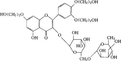 C33H42O19=742.68 CAS-7085-55-4 3′,4′,7-三(羟乙基)芦丁。 3′,4′,7-Tris(hydroxyethyl)rutin. 心血管病药。用于闭塞前综合征、血栓性静脉炎、毛细血管出血等。 羟乙基芦丁,维生素P4,三羟乙基芦丁,维诺芦通。 Venoruton,Troxerutin, Hydroxyethylrutin,Trioxyethylrutin,Posorutin,Venorutin-P4,Vitamin P4,THR. 维脑路通片(羟乙基芦丁片),维脑路通注射液(羟乙基芦丁注射液),维脑路通胶囊(羟乙基芦丁胶囊)。 INN,BAN,DCF,NFN,USAN,MI.  |