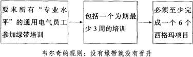 释义 | 绿带 负责执行6个西格玛计划的主要群体。虽然成员并不是专职的质量管理者,但他们还是应该利用6个西格玛工具来完成他们的主要工作。韦尔奇的目标是保证通用电气的每个专业员工都获得一条腰带。韦尔奇使公司员工的晋升“依赖于腰带”(没有腰带就没有晋升)。1997年3月,韦尔奇发出一个备忘录,宣布了没有腰带就没有晋升的政策。该政策要求通用电气的所有专业员工在1999年1月前开始绿带或黑带培训。在此后的3年中,通用电气拥有了100000名绿带级员工。 |
