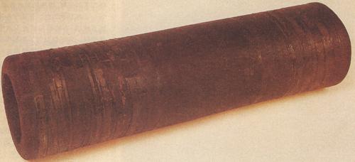 释义 | 缠藤篾朱漆木筒 ◎容器/新石器时代早期 1978年浙江余姚河姆渡遗址出土 长32.6厘米 直径9.4厘米 壁厚0.7厘米 木、藤/浙江省博物馆藏 ●此筒用整段木料精制而成,内外壁错磨光洁,器壁薄厚均匀,可见当时木器制作工艺已达到相当高水平。 木筒外壁两端对称地缠有数道藤篾箍圈,既可坚固器体,又具装饰效果,显见制作者之匠心。从隐现光泽的漆痕看,器表曾涂有一层薄薄的调朱漆。 该木筒亦为我国现已发现的最早漆器之一。 它不仅开后代漆器做工精细之先河,而且亦是后世漆器装饰的源头。 |