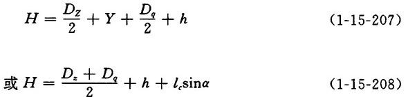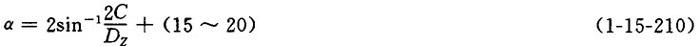 【说明】 参见图1-15-23。 (a)-无驱网辊时 (b)-有驱网辊及真容吸移辊时 1-真空伏辊 2-驱网辊 3-吸移辊 4-底轨 1.当无驱网辊时的网案高度计算 【公式】 H=Dz+h (1-15-206) 式中 H——网案高度(mm) Dz——真空伏辊直径(mm) h——真空伏辊下方的高度(mm),通常对于常见的悬臂式和移出式网案可取h=400~600mm 2.有驱网辊及真空吸移辊时的网案高度计算 【公式】  式中 H——网案高度(mm) Dq——驱网辊直径(mm) lc——真空伏辊与驱网辊间的中心距(mm),初步设计时可取为:  Dx——真空吸移辊直径(mm) α——真空伏辊与驱网辊间的网段相对于水平线的倾射角度,即成形网在真空伏辊上的包角(度),在初步设计时可取为:  C——真空伏辊真空箱吸口总宽度(mm) |