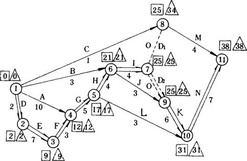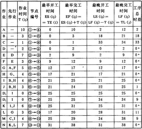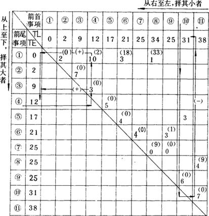 释义 | 网络图关键线路计算法 网络图中,完成各道工序需要时间最长的路,称关键线路,它是网络计划中的主要矛盾线,决定著工程的完工期。 在网络图上,我们可以通过找到工序总时差为零的工序即关键工序,由关键工序组成的线路得到关键线路。 关键线路的计算方法有三种: 方法一:图算法 在网络图上,计算出每个节点的最早开始时间(TE)及最晚完成时间(TL),然后比较同一节点的最早开始时间与最晚完成时间,其差为零者即为关键节点,从头至尾与关键节点相连的工序即为关键工序,由此组成关键线路。 步骤: (1)从左至右计算每一节点的最早开始时间。根据节点编号从小至大,顺序计算,并标在节点上方,用方框圈起来。 计算方法:定始点TE(i)=0 按公式TE(j)=max{TE(i)+T(ij)}推算。 (2)计算节点最晚完成时间,待图中全部节点最早开始时间计算完毕后,在图中从右至左,按节点编号从大至小,逆序计算,并标在节点上方,用三角框圈起来。 计算方法:定终点TL(n)=TE(n) 按公式: (3)计算节点(事项)时差,确定关键节点及关键工序,并用双线在图中标出关键线路。 计算方法:按TE(i)-TL(i)或TE(j)-TL(j)计算,为零者即为关键节点。实际上可采用观察法,节点上方“□”内数字与“Δ”内数字相同的节点,即为关键节点。 例,用图算法求下述网络关键线路及完工周期。 单位:天 关键线路: 即:D→E→F→G→H→I→K→N 完工周期:38天。 方法二:表算法 设计表格,在表上填写各道工序及其作业时间,按照计算工序参数ES(ij),EF(ij),LS(ij),LF(ij)及ZC(ij)的顺序,根据计算各项时间参数的公式,在表格上逐道工序进行计算。首先计算ES(ij)和EF(ij),在表中由始点开始,按从上至下的顺序逐个工序进行。 然后计算LS(ij)与LF(ij),在表中由终点开始,由下至上逐个工序进行计算。然后根据上述参数,计算各道工序的总时差zC(ij),由总时差为零的工序构成关键线路。 例:用表算法解图算法网络例题。 从表上由工序总时差为零的工序(表中标*者),可得到关键线路: D→E→F→G→H→I→K→N 完工期38天。 方法三:矩阵算法 矩阵法是将网络图反映的各工序间的关系,用一张矩阵表表示出来,以计算事项的时间参数来寻找关键线路的。 (1)制作矩阵表。 作一张与网络图中节点数目相同的方形矩阵表,在横行与竖列上分别从上至下、从左至右按顺序写上事项编号。 并以行为箭尾事项,列为箭首事项(矩阵表中i行与j列交叉元素,即表示工序i→j),顺序把各工序作业时间填入相应格内。并在矩阵表中另加一行,另加一列(行加在矩阵表上方,列加在矩阵表左边),用于填写计算出的事项最迟完成时间与最早开始时间。 (2)从上至下逐个计算事项最早开始时间。 其方法是:首先规定TE(1)=0。计算某行TE时,找到与这一行数相同的列元素,将该列中有数字格中的数字与对应行的TE值相加,择其大者即为所求行对应事项TE值。 (3)TE列全部计算完毕后,然后计算事项最晚完成时间(即TL行数值),计算顺序从右至左逐个进行。其方法是:规定最末TL(n)=TE(n),即将表中TE列最下方数字填入TL列最右边格内。 计算某列TL时,找到与这一列数相同的行元素,将该行中有数字格中的数字用对应列的TL值减掉,择其小者,即为所求列对应事项的TL值。 (4)从表上读出关键线路,在矩阵表中TE值与TL值相等的节点,即为关键节点,其交叉元素即为关键工序。 另外,从矩阵表上还可直接计算出各工序总时差。其方法是:将矩阵表中有数字格所在列对应的TL值,减去所在行对应的TE值,再减去该元素值,即为该工序总时差,可填在该格用“()”括起。 例:用矩阵算法解图算法例题。 由表中读出关键线路: 即D→E→F→G→H→I→K→N 完工周期:38天。 |