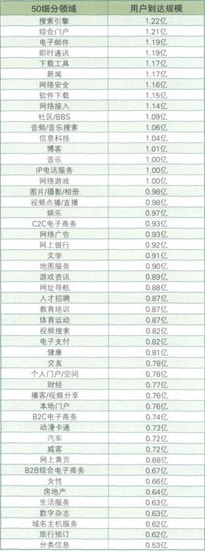 中国的网络广告年增长率在40%到50%之间,而整体的广告(传统广告和网络广告)增长率在15%到20%之间。 网络广告市场快速发展的驱动器已经由“广告主数量增长推动”发展为“广告投放额度推动”。 广告主行业集中度呈下降趋势,网络广告市场份额趋于分散,垂直网站广告收入增长潜力巨大。三大门户网站虽然网络广告收入一直增加,但是在市场总规模中所占比例越来越低。新浪在整个广告市场的收入比重由41.5%下降到20.4%,而搜狐由18.5%到13.9%,网易不足10%。 目前垂直网站广告收入规模与门户网站相比仍有较大差距,但广告收入总体呈上升趋势。  网络上的广告位 中国互联网产业50细分领域及用户到达规模(2006年) (用户年到达规模指某项互联网服务过去一年中所到达的使用过该服务的用户的总量)