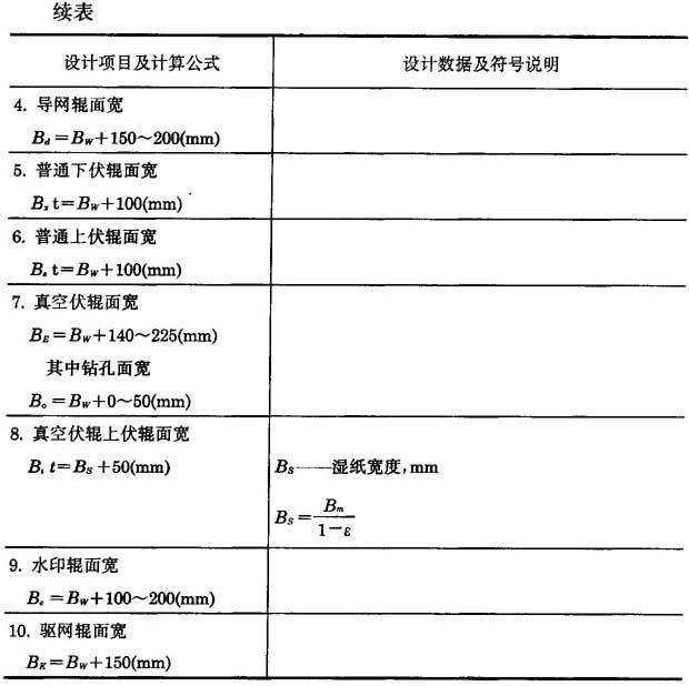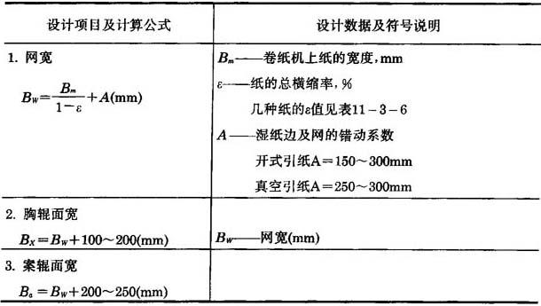 释义 | 网部各种辊子的面宽和直径 1.网部各种辊子的面宽 网部各种辊子的面宽可参考表11-3-12所示的方法计算。 表11-3-12 网部各种辊子面宽经验计算表 2.网部各种辊子的直径 网部各种辊子的直径示例可参看表11-3-5所列的数据。 表11-3-5 长网网案规格示例表 |