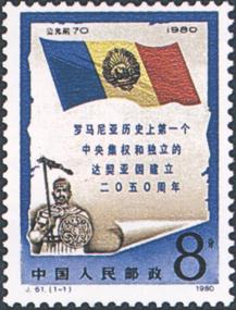 释义 | 罗马尼亚历史上第一个中央集权和独立的达契亚国建立二〇五〇周年 发行日期:1980年9月20日 齿孔度数: 印刷版别:影写版 票幅:30×40 全张枚数:50(10×5) 设计者:孙传哲 印刷:北京邮票厂 (1)8分 国旗和达契亚士兵 500万枚 1枚全 |