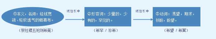 字源解说 “希”是“絺”的本字。巾,既是声旁也是形旁,表示布帛。希,篆文 = (爻,交织状)+ (巾,布帛),表示古代手工纺织的布帛。造字本义:古代专门为帝王权贵精工纺织的经线宽疏、轻软透气的细葛布。隶书 承续篆文字形。当“希”的本义消失后,篆文 再加“糸”(丝织物)另造“絺”代替。附 《尔雅·释诂下》:希,罕也。《集韵·微韵》:希,寡也。 引申线索