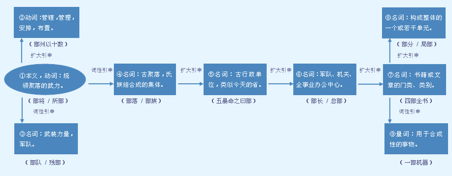 字源解说 不,既是声旁也是形旁,表示竹削武器。部,古鈢字形 = (不,原始的竹削武器,代表武力)+ (邑,聚落)+ (口,命令),表示统领聚落的武装。造字本义:统领聚落武装。篆文 将古鈢字形中的“不” 与“口” 连写成 。隶书 将篆文的 简化成“咅” ,将篆文的“邑” 简化成“双耳旁” 。 附 文言版《説文解字》:部,天水狄部。从邑,咅聲。 附 白话版《说文解字》:部,天水郡狄部所在地。字形采用“邑”作边旁,采用“咅”作声旁。 引申线索