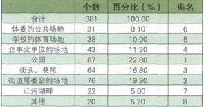 释义 | 群众体育活动时间 根据调查,早晨8点以前活动的群众体育活动点占多数,占79.80%;晚上活动的占48.6%,居第二位;上午和下午活动的活动点相对较少。 多数活动点在早晨8点以前活动,这与活动点的活动场所有关。公园、街道居委会场地和街头巷尾是活动点中居前3位的活动场所,表中的这些场所早晨空闲,可以开展体育活动,也与中国人民特别是老年人“早起早睡”的作息习惯有关。 城市里的体育设施老少皆宜 北京体育活动场所的分布 |