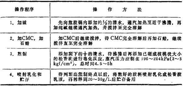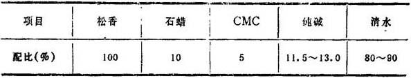 用白色松香胶对纸料进行施胶,夏季在有些造纸厂中发生施胶困难,即松香胶耗用量大增,有时施胶度还达不到标准,其原因是夏季水温偏高,松香胶乳液易于变质沉淀,并且微粒胶粒易于聚集。选用羧甲基纤维素石蜡松香胶可以大体防止这一问题的发生。 一种羧甲基纤维素石蜡松香胶的熬制实例: (1)配比 这种胶料的配比如表10—2—123所示。 表10—2—123  注:表中所列的石蜡、CMC、纯碱和清水的数值均为对松香的重量百分比。 (2)操作程序 这种胶料是在1m3夹套熬胶锅内进行熬制,搅拌器的转数为230~240r/min。熬制的操作程序如表10—2—124所示。 表10—2—124  (3)应用 生产实践证明,施用羧甲基纤维素石蜡松香胶以后,胶料的用量可以减少,而纸张的施胶度稳定,不受季节水温的影响。 |