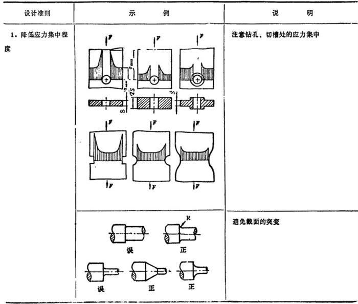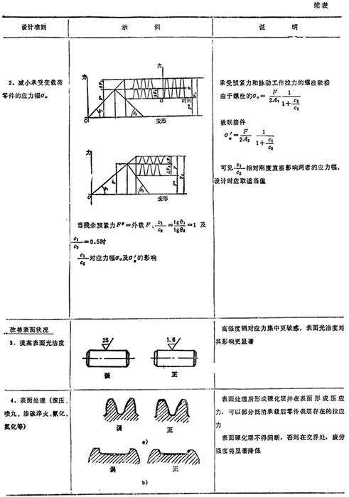 | 释义 | 考虑疲劳强度的合理设计 当零件所受最大应力一定时,应力幅σα的大小、应力集中的程度、零件表面状况和形状尺寸等因素,均会影响零件的疲劳强度。考虑疲劳强度合理设计的准则和示例见表3.5-2。 表3.5-2 考虑疲劳强度合理设计的设计准则和示例