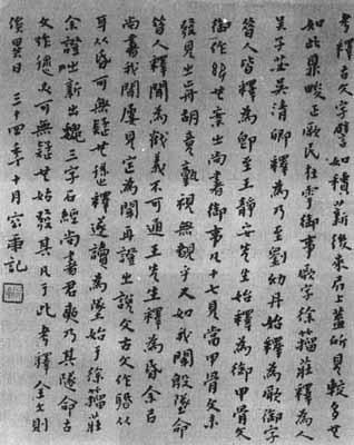 释义 | 考释古文字题跋 【简介】: 现代·容庚书于民国三十四年(1945)。纸本。行书。凡十二行,每行字数不一。刊于《民国时期书法》(上)。 【赏析】: 欣赏前人的书札有趣,欣赏前人的题跋也有趣,因爲在欣赏书法的同时,可以增长许多知识,助长兴味。 容氏此跋,谈了每一个古文字考释的过程,很有意义。但因语涉专门,容氏还写了几个篆书式的楷书,标点译释不易,其实通读也不难。今将全文标点如下: 考释古文字,譬如积薪,后来居上,盖所见较多也。如此鼎“正厥民,在雩御事。”“厥”字,徐籀庄释爲人,吴子苾、吴淸卿释爲乃,至刘幼丹始释爲厥。“御”字昔人皆释爲即,至王静安始释爲御。甲骨文御作“ 符按:近有人释 如果单单就字论字,我们也可以说容庚写得很雅,很坚实,但如文章不能读明白,未免辜负了文中的意思。看来研究中国书法,要有点文化知识,不要把文化和艺术完全割裂。 |
