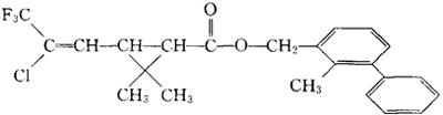 释义 | 联苯菊酯 又称天王星、虫螨灵。 中等毒性杀虫杀螨剂。化学名称:3-(2-氯-3,3,3,-三氟丙烯1-基)-2,2-二甲基环丙烷羧酸酯。化学结构式如下。 纯品熔点68~70.6℃,密度1.21(25℃),25℃时蒸气压241.31×10-7Pa,不溶于水,溶于氯甲烷、甲苯、丙酮等溶剂。 原药90%~96%熔点57~64℃。拟除虫菊酯类杀虫剂。 杀虫广谱,残效期长,适用于棉花、果树、蔬菜及其他经济作物上害虫害螨的防治。大鼠经口LD50为54.5mg/kg,兔经皮LD50>2000mg/kg。 无刺激作用,对鱼高毒,虹鳟196hLC50为0.15μg/L。 |