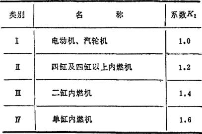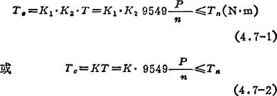 各类联轴器在传动轴系中的作用见表4.7-1。联轴器的分类见表4.7-2。 表4.7-1 各类联轴器在传动轴系中的作用  选用联轴器时,应先考虑原动机的机械特性,然后根据工作机的载荷类别(常以工况系数K2反映其对联轴器工作的影响)以及联轴器的许用转速、所联两轴的相对位移、传动精度、外形尺寸、安装维护情况和工作环境(如温度、湿度、粉尘、油、酸、碱介质等)进行合理选择。联轴器的计算转矩Te由下式计算:  式中 T为理论转矩(N·m);Tn为联轴器允许的公称转矩(N·m);P为联轴器所传递的功率(kW);n为工作转速(r/min);K为载荷系数,见表4.7-4;K1为原动机系数,见表4.7-3;K2为工况系数,参见〔43〕。 表4.7-3 原动机的类别、名称及系数K1  |