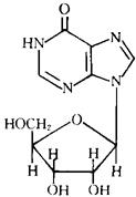释义 | 肌苷 又称次黄苷。 次黄嘌呤与核糖组成的核苷。结构式如右。某些tRNA中的一种修饰核苷。肌苷酸部分水解的产物。可以直接进入细胞,参与糖代谢、能量代谢及蛋白质合成,具有活化肝功能、促进受损肝脏恢复、刺激体内产生抗体等作用。常用于治疗急慢性肝炎、心肌梗塞、白细胞减少等多种疾病。 |