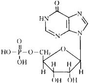 又称次黄苷酸、一磷酸次黄苷(inosinemonophosphate)。 由次黄嘌呤、核糖和磷酸组成的5′-核苷酸。缩写符号为IMP。 结构式如下。是生物体内各种嘌呤核苷酸从头合成过程中首先合成的一种嘌呤核苷酸,然后再转变成其他嘌呤核苷酸。出现在某些tRNA中,作为反密码子中的一个核苷酸。广泛存在于肉类中,由ATP降解产生。 其钠盐为无色结晶或白色粉末,有特异的鲜鱼味,易溶于水。在食品上作鲜味剂,与鸟苷酸钠及谷氨酸钠混合使用,可使味精的鲜度提高数倍。 在医药上用于治疗多种肝病、心脏病以及血小板和白细胞减少症。