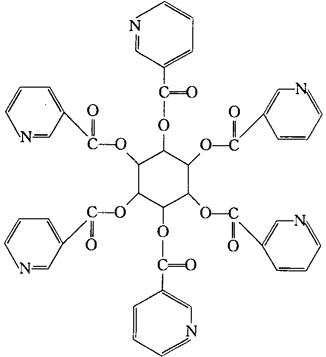 C42H30N6O12=810.73 CAS-6556-11-2 内消旋-六烟酸肌醇酯。 Meso-inositol hexanicotinate. 1,2,3,5/4,6环己六醇六尼古丁酸酯。 1,2,3,5/4,6 Cyclohexanehexol hexanicotinate. 降血酯药。具有降低胆固醇及扩张末梢血管的作用。 用于高胆固醇血症、动脉粥样硬化及末梢血管障碍性疾病等的辅助治疗。 烟酸肌醇酯,烟肌醇,六烟酸肌醇酯。 Inositol Nicotinate,Inositol Niacinate,Hexopal,Inositol Hexanicotinate,Myo-inostol Hexanicotinate,Palohex,Win-9154. 肌醇烟酸酯片。 INN,BAN,BP,DCIT,FP,JP,NFN,USAN,MI.