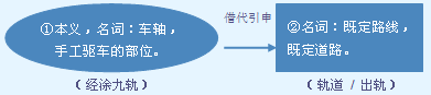 字源解说 轨,金文 = (车,炮车)+ (九,手臂),造字本义:车轴,手工驱车的部位。古代战车没有动力,靠马力或手工驱动。篆文 承续金文字形。 附 文言版《説文解字》:軌,車徹也。从車九聲。 附 白话版《说文解字》:轨,车轮辗压的痕迹。字形采用“车”作边旁,“九”作声旁。 引申线索