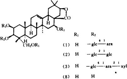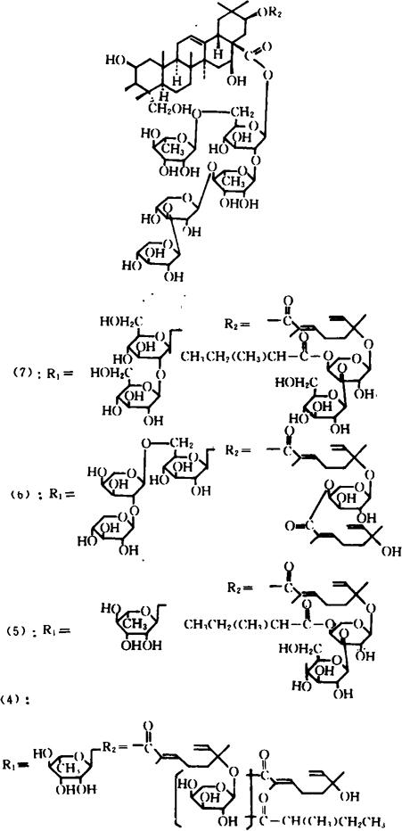 释义 | 肥皂荚 【概况】: 异名 肉皂角(《药材学》)。 基源 为豆科肥皂荚属植物肥皂荚的果实。肥皂荚属全世界3~4种;中国1种,药用。 原植物 肥皂荚Gymnocladus chinensis Baill.,又名肥猪子(《中国树木志略》),肥皂树、油皂(湖南)。 历史 本品始见于《纲目》。 谓:“肥皂荚生高山中。其树高大,叶如檀及皂荚叶;五六月开白花;结荚长三四寸,状如云实之荚,而肥厚多肉;内有黑子数颗,大如指头,不正圆,其色如漆而甚坚,中有白仁如粟,煨熟可食,亦可种之。”其形态描述与本种相符。 形态 落叶乔木,无刺,高5~12m;树皮灰褐色,皮孔白色;嫩枝被锈色或白色短柔毛,后脱落。二回双数羽状复叶,长20~25cm,叶轴具槽,被短柔毛;羽片5~10对;小叶8~12对,互生,近无柄;小托叶钻形,小叶片长圆形,长2.5~5cm,宽1~1.5cm,两端圆钝,先端微凹,基部偏斜,两面被绢毛。 总状花序顶生,被短柔毛;花杂性,白色或带紫色,下垂,具长梗;苞片小;花萼钟形,长0.5~0.6cm,被短柔毛;萼齿钻形,短于花托;花瓣片长圆形,先端钝,长于萼片,被硬毛;花丝被柔毛;子房无毛,无柄,胚珠4~5,花柱粗短,柱头头状。荚果长圆形,长7~10cm,宽3~4cm,扁平或膨胀,无毛,先端具喙。种子2~4,近扁球形,直径约2cm,黑色,光滑。 花期5~6月,果期8月。(图见《中国植物志》.第39卷.80页.图版27) 生境与分布 生于海拔150~1500m山坡、谷地、杂木林中以及岩边、村边。现广为栽培。 分布于江苏、安徽、浙江、江西、福建、湖北、湖南、广东、广西、四川。。【生药】: 采集 10月采摘果实,阴干。 【化学】: 含2个单萜糖甙:(6S)-2-顺式-6-α-L-吡喃阿拉伯糖氧基-2,6-二甲基-2,7-辛二烯酸〔(6S)-2-trans-6-α-LArabinopyranosyloxy-2,6-dimethyl-2,7-Octadienoicacid〕、(6S)-2-反式-2,6-二甲基-6-〔3-O-(β-D-吡喃葡萄糖基)-4-O-(2-甲基丁酸基)-d-L-吡喃阿拉伯糖氧基-2,7-辛二烯酸〔(6S)-2-trans-2,6-Dimethyl-6-〔3-O(β-D-glucopyranosyl)-4-O-(2-methylbutyroyl)-d-Larabinopyranosyloxyl-2,7-octadienoic acid〕[1],三萜皂甙:肥皂荚皂甙(Gymnocladus saponin)A(1)、B(2)、C(3)、D、D1(4)、E(5)、F1(6)、F2(7)、G,其皂甙元(Sapogenin)为2β,23-Dihydroxy acacic acid lactone(8)[2] Gymnocladus saponin D的结构为2β,23-二羟基-3-O-α-L-吡喃鼠李糖基-21-O〔(6S)-2-反式-2,6-二甲基-6-α-L-吡喃阿拉伯糖氧基-2,7-辛二酸基〕金合欢酸28-O-β-D-吡喃木糖基-(1→3)-β-D-吡喃木糖基-(1→2)-〔L-吡喃鼠李糖基-(1→6)〕-β-D-吡喃葡萄糖基-(1→2)-β-D-吡喃葡萄糖甙的(6S)-2-反式-2,6-二甲基-6-羟基-2,7-辛二酸盐[3]。 Gymnocladus saponin D1(4)、E(5)、F1(6)、F2(7)的结构式为[4]: Gymnocladus aponin G的结构为2β,23-二羟基-3-O-〔β-D-吡喃本糖基-(1→2)-α-L-吡喃阿拉伯糖基-(1→6)-β-D-吡喃葡萄糖基〕-21-O-{(6S)-2-反-2,6-二甲基-6-〔3-O-(β-D-吡喃葡萄糖基)-4-O-(2-甲基丁酸基-α-L-吡喃阿拉伯氧基〕-2,7-辛二烯酸基)金合欢酸28-O-β-D-吡喃木糖基-(1→3)-β-D-吡喃木糖基(1→4)-α- L-吡喃鼠李糖基-(1→2)-〔α-L-吡喃鼠李糖基-(1→6)〕-β-D-吡喃葡萄糖甙(2β,23-Dihydroxy-3-O-〔β-DXylopyranosyl-(1→2)-α-L-arabinopyranosyl-(1→6)-β-D-glucopyranosyl〕-21-O-{(6S)-2-trans-2,6-dimethyl-6-〔3-O-(β-D-glucopyranosyl)-4-O-(2-methylbutyroyl-α-L-arabinopyranosyloxy〕-2,7-Octadienoyl)acacic acid 28-O-β-D-xylopyranosyl-(1→3)-β-D-xylopyranosyl-(1→4)α-L-rhamopyranosyl-(1→2)-〔α-L-rhamnopyranosyl-(1→6)〕-β-Dglucopyranoside)[4]。 参考文献 [1] Chem Pharm Bull 1984;32(7)∶2617 [2] Chem Pharm Bull 1984;32(12)∶4833 [3] Chem Pharm Bull 1985;33(11)∶4732 [4] Chem Pharm Bull 1987;35(1)∶46 【药性】: 性味 辛,温。 ❶ 《纲目》:“辛,温,微毒。” 功效 祛风除湿,活血消肿。 主治 风湿疼痛,跌打损伤,疔疮肿毒。 ❶ 《纲目》:“去风湿,下痢,便血,疮、癣、肿毒。” ” 用法用量 内服:煎汤,1.5~3g;或入丸、散。外用:捣敷、研末撒或调涂。 使用注意 《本草汇言》:“胃弱少食,不食之疾,忌用之。”。【临床应用】: 单方应用 ❶ 《普济方》:“治肠风:肥皂英(独牙者),烧灰存性,以1片研末,糕糊丸,1片为末,饮汤调吞下。” 食疗 《乾坤生意》:“治下痢噤口:肥皂荚1枚,以盐实其内,烧存性为末,以少许入白米粥内食之。”。【医药家论述】: ❶ 缪希雍《本草经疏》:“凡肠胃有垢腻秽恶之气,郁于中则外生瘰疬恶疮肿毒;泄于外则为肠风,下痢脓血。肥皂荚专能荡涤垢腻,宣通秽积,肠胃洁净则诸证自除也。” ” |