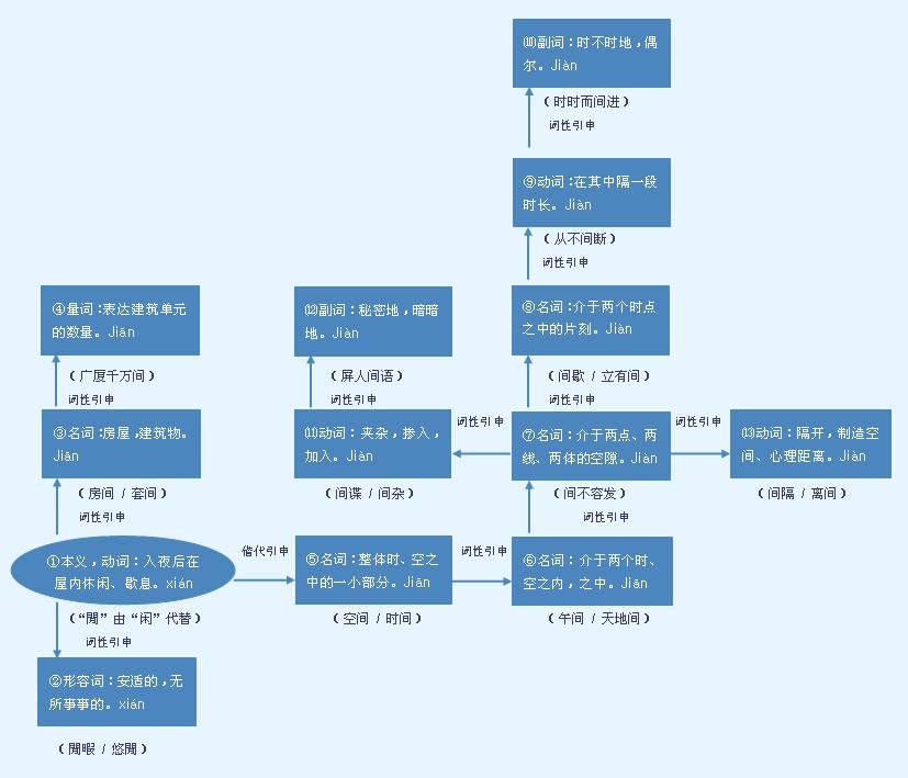 释义 | ![]() (間) 空隙,距离,差别。很少单独用,常用在固定词组中。 乘~而入|亲密无~|美丑有~。 ❶隔开,不连接。不能重叠。常带“着”,不能带趋向动词。作带宾谓语。 学校与我家~着一条大河|我们两家只~着一堵墙。 ❷拔去或锄去。限用于多余的秧苗。能重叠。作带宾、带补谓语。 妈妈顶着太阳~玉米苗|他慢慢地~着苗儿|你可以去~~菜秧儿|他迅速地~完了高粱。 【近】 〈动〉❶隔 【词语】 间谍 间断 间隔 间或 间苗 间日 间隙 间歇 间杂 间作 【注意】 又读jiān,如:间架、房间、人间。 字源解说 “间”与“閒”同源,后分化。閒,金文 ![]() ![]() ![]() ![]() ![]() ![]() ![]() ![]() ![]() ![]() ![]() 附 文言版《説文解字》:閒,隙也。从门,从月。 ![]() 附 白话版《说文解字》:间,缝隙。字形采用“门、月”会义。 ![]() 引申线索 ![]() 【字族索引】 间 【同音字】 jiān jiàn |