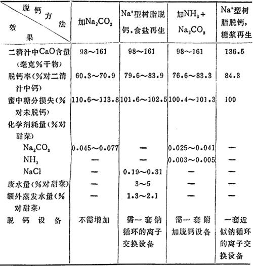 释义 | 脱钙方法的比较 为除去稀汁中的钙盐,目前可以采用的方法有: 1.向一碳汁中加入适量的Na2CO3 前已叙及除去1克当量的钙盐,约需1.5~2.0克当量的碳酸钠。加入量不足时,不能保证脱钙效果。大量加入碳酸钠无疑地要增加蜜中糖分损失。 2.用Na+型阳离子交换树脂脱钙 食盐再生。以Na+置换稀汁中的Ca++,用10%的NaCl溶液再生。因为钠的成蜜特性高于钙,将会增加蜜中糖分损失,再生前交换柱的洗水要稀释糖汁。也增加糖分损失。同时还要排放再生废水。 3.用NH3和Na2CO3脱钙 将二碳未滤汁引入脱钙反应器,在反应器中加入少量NH3及Na2CO3,同时加入再生的(NH4)2CO3,脱钙后的糖汁加热,过滤后煮沸以回收NH3及(NH4)2CO3循环再用。1克当量的钙需0.8克当量的碳酸钠。 4.用Na+型阳离子交换树脂脱钙 用糖浆再生。稀汁通过离子交换柱后,钙镁等离子被树脂吸附,Na+离子移入糖汁中。利用软化后的糖汁制得的糖浆去再生树脂。这样,消除了用食盐再生的一些缺点。但是用于再生的糖浆中所含钾、钠的浓度相当于脱钙前的含量,钾、钠离子浓度仅为10%食盐溶液的1/6~1/8,与用食盐再生相比,其交换量的利用率较低,再生时间长。同时必须选取对二价阳离子选择性较低的大孔隙树脂。最新有建议以二原蜜再生,这样可减轻钙盐对一、二膏煮糖的影响。 上述脱钙方法的比较见表4-43。 表4-43 各种脱钙方法的对比 |