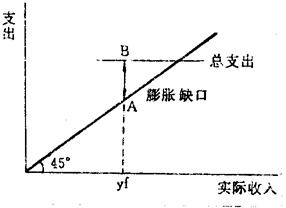 | 释义 | 膨胀缺口 总支出超过可以得到的最大产出水平,以致产生一个价格向上的压力。 在简单的收入——支出模型中,膨胀缺口是由与45°线相交并超过充分就业水平yf的总支出函数表示出来的。如图所示。