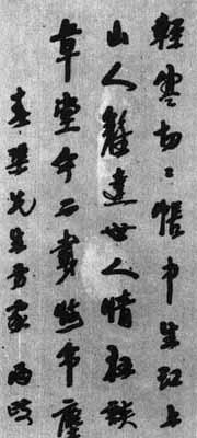 【简介】: 近代·杨钧书于一九三一年。纸本。行书。七言诗一首。凡四行,每行字数不一,共八十九字。刊于《近代名人书林》、《民国时期书法》(下)。 【赏析】: 作者以隷书用笔入行书,写得遒浑沉酣,环纡峻密。他的线条笔墨饱满,锋芒深藏不露,但又并不凝滞,能随字势而盘旋流动。结字具有十分明显的茂密遒紧的造型意识,如老藤盘结,神气沉实内敛。通篇也不乏斜正、大小、横纵等多种变化,密集的字势与疏朗的字间、行间空间互爲反衬,密者更显其密,朗者更显其朗。但作者在字内空间的分布上,对疏与密、收与放的对立统一关係处理得欠佳。一味的密集与过多的盘抱,使字势郁而不舒,有困闷感;通篇沉实有余,而少朗健飞动,眉目欠淸而难耀神采。作者是一位很有修养的书画鑒赏家,所著《草堂之灵》,其中对于书法有很多高明的见解。但由此作观之,一个好的鑒赏家未必是一个出色的创作实践者。但一个成功的书画家,却必须具备较深的理论修养。  |