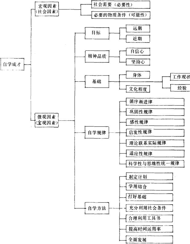 | 释义 | 自学成才 指人们通过选择一定目标进行自我学习而获取知识和技能的成才方法。 自学有广义和狭义之分。广义上的自学指所有的人不断摄取新知识的自觉活动。狭义的自学指那些失去了高等教育机会的人,主要依靠自己努力学习,获取知识和技能的自觉活动。 自学是相对于正规学校教育的特殊的学习活动,没有客观规定的强迫性指标,没有专门的物质条件(时间、教育设施等)和专门教师指导,是没有组织的自我学习。 自学人才是指进入社会后在待业中自学,或通过业余自学研究,从而走上成才之路者。在历史上,自学成才是人才成长的一条重要道路。 古往今来的自学成才者,既有相当的数量,又有相当的质量。据统计,近代以来作家中有40%的人未上过大学,技术发明家中有近半数的人未受过高等教育。 成才者的自学是一种科学行为,有其内在规律。由于自学对象的性质和自学者主观因素的特点,决定了自学是一种复杂的社会实践活动,不可能有一个固定的模式,但又有一些可以借鉴的方法。自学成才通常有五条原则:(1)坚持正确的自学方向,为社会进步发愤学习,结合本职工作选准目标。(2)有坚强的信心,坚信自学能够成才。 (3)勤奋,能经得起挫折和失败的考验,千锤百炼,百折不挠。(4)扎扎实实,打好基础。 (5)逐步培养,不断提高自学能力。 自1978年以来,党和国家积极号召并提供各种条件,组织我国人民,尤其是青年和干部自学成才。1981年后,中央和省市相继成立了自学高考委员会,并将自学教育与普通教育、职业教育、业余教育、在职教育并列为我国的五大教育系列之一。规定凡是经国家指定机构考试,考核合格者都承认其学历,发给文凭,在录用、招聘、提拔、评定职称、工资福利等方面享受相应的同等待遇。 许多省市成立了自学指导、辅导、咨询等服务机构,创办了指导自学的刊物。 自学成才结构图: