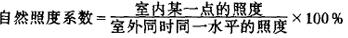 又称采光系数。指室内工作面某一点的照度与同时间室外开阔天空散射光(全阴天)的水平照度的比值,通常以百分数表示,其公式如下: