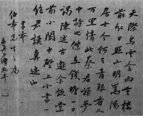 释义 | 致伯希先生行书横披 【简介】: 现代·傅斯年书。纸本。行书。凡十一行。刊于《民国时期书法》(中)。 【赏析】: 不知是诗情牵动了书家,还是钱塘景色感染了书家,要么就是开怀畅飮,谈古论今激起了书家的情怀。这件行书横披,令人感到诗也悠悠、墨也悠悠、情也悠悠。笔意依诗情起伏,气势随心緖迭宕。作品一挥而就,淸醇秀雅,空灵而超迈。如浩浩钱塘,如悠悠历史。书法欣赏常有这样的现象,一幅作品,说不出它有什么特殊的地方,可它却给你一种异样的感受,逼著你有所思。傅斯年的这幅作品,得神韵于无意之中,以其自然灵动的笔墨,飘逸含蓄的风貌,给欣赏者以无限的遐想。 |