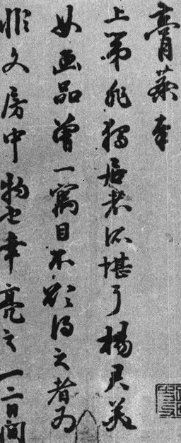 【赏析】: 在书法创作的挥运之中,旣要不失点画之美,又要在线的运动中充分涵容书作者情感的起伏敛纵,不是一件容易的事。朱大韶的书作是努力在这个阶梯上攀援。刚柔相济的点画中,充盈著俊劲淸和的情致,毫无造作之态。紧劲丰腴,大小参差的结字及较紧的字距,与宽松的行距相得益彰。书作者对于黑白相成的形式美,表现出书法家应有的敏感。但是,他显然更注意于字势的聚敛,因而不免略有窘促之感。 |