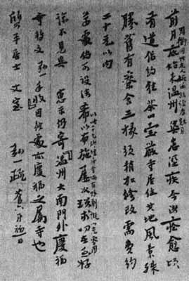 【简介】: 近代·弘一法师移居温州时书。纸本。行书。八行大字,附二行补言。刊于《中国书法》一九八六年第四期。 【赏析】: 弘一法师是我国本世纪初以来著名的多才多艺的艺术家。由于国事败坏,他胸中苦闷之极,终于遁世出家爲僧。朱光潜评价他“以出世的精神做著入世的事业”。他的书法也由此大变,由康有爲倡导的“入碑“变爲虔诚的“禅宗”;由方硬,丰厚的碑意衍爲不激不励的,心平手稳的禅意。此帖虽爲书信,却如念佛,不紧不慢,持重之极,淸朗之极,凝重饱满。从此信札中可以窥见,他在点画结构的取势上:凡横不敛,凡竪不连,左撇一扫即收,右捺一伸即缩,结体蕩蕩而无尽情发洩之处,恰似念佛,绝对淸心寡欲。此帖中有的字偶有长横大波,虽长入而不大出,右高左低之势一贯始终,重心绝不右移。如帖中第一行的“底”、“染”、“疾”、“痊”,第六行的“亦”、“寄”、“庆”等字的长横,第七行的“处”、“之”等字的大波,即爲此等状态。他这种浸透“禅意”的书法意向,在书坛中也颇有影响,可以说是一种熔文、史、哲、书于一炉的“综合艺术”。