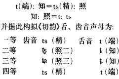 其中齿音有三套,舌音只有两套,又齿音精、照一组还出现于三等韵中,与舌音并不成完全的对应比例。此外,喻世长提出了另一个比例式: