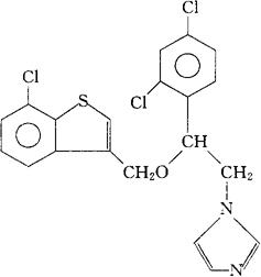 释义 | 舍他康唑 C20H15Cl3N2OS=437.77 CAS-99592-32-2 (±)-1-[2,4-二氯-β-[(7-氯苯并[b]噻吩-3-基)甲氧]苯乙基]咪唑。 (±)-1-[2,4-Dichloro-β-[(7-chlorobenzo[b]thien-3-yl)methoxy]phenethyl]imidazole. 抗真菌药。 Sertaconazole. INN,USAN. |