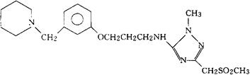 C20H31N5O3S=421.56 CAS-80343-63-1 1-甲基-3-[(甲磺酰)甲基]-N-[3-[3-(1-哌啶甲基)苯氧]丙基]-1H-1,2,4-三唑-5-胺。 1-Methyl-3-[(methylsulfonyl)methyl]-N-[3-[3-(1-piperidinylmethyl)phenoxy]propyl]-1H-1,2,4-triazol-5-amine. 1-[间-[3-[[1-甲基-3-[(甲磺酰)甲基]-1H-1,2,4-三唑-5基]氨基]丙氧]苄基]哌啶。 1-[m-[3-[[1-Methyl-3-[(methylsulfonyl)methyl]-1H-1,2,4-triazol-5-yl]amino]propoxy]benzyl]piperidine. 组胺H2-受体阻断药。 Sufotidine,AH 25352X. INN,BAN,USAN.  |