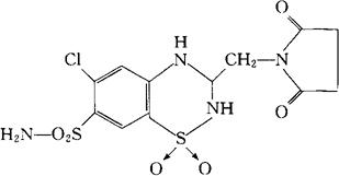 释义 | 舒美噻嗪 C12H13ClN4O6S2=408.83 CAS-32059-27-1 6-氯-3,4-二氢-3-琥珀酰亚胺基甲基-2H-1,2,4-苯并噻二嗪-7-磺酰胺1,1-二氧化物。 6-Chloro-3,4-dihydro-3-succinimidomethyl-2H-1,2,4-benzothiadiazine-7-sulfonamide 1,1-dioxide. 利尿药。 Sumetizide,Hypotensine. INN,DCF,DCIT,USAN. |