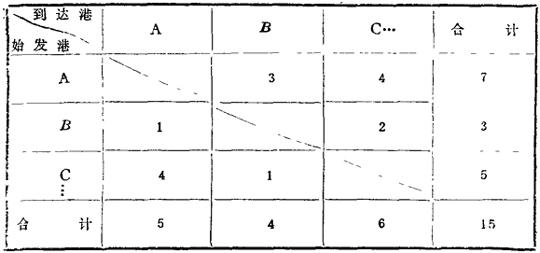 各港站间发出和到达的船舶流量的棋盘表。左边第一列与上边第一行分别列出港站名称。左边第一列表示船舶始发港,上面第一行为表示船舶到达港。