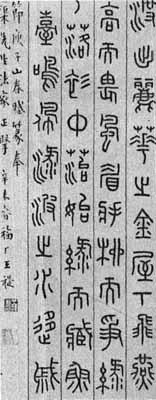 【简介】: 现代·王福庵书于一九三一年。纸本。篆书。凡五行,附款字二行。书赠春渠先生。刊于《当代名人书林》、《民国时期书法》(上)。 【赏析】: 王福庵这幅小篆,结体工稳,温润典雅,篆法循规入矩,无丝毫草率之处。结体疏密匀凈,线条骨力中涵,瘦硬挺劲,无一懈笔。取法高古,用小篆体势,去先秦及淸季篆书拉长垂脚习尙,颇有石鼓文之遗意。通篇大小错落,与一般写工稳一路篆书齐整划一的排法不同。福庵爲篆印大家,故能以书入印,以印促书。观此篆书,颇具元朱文印的恬润之感。署款楷书亦精雅,虽与正文书体不同,而风格一致,形成统一中的变化。款书杂以碑意,尤可见印章边款小楷书的韵味。对此书作,犹如观赏秀美洁凈的元朱文印配以魏晋风致的边款,珠联璧合,耐人寻味。