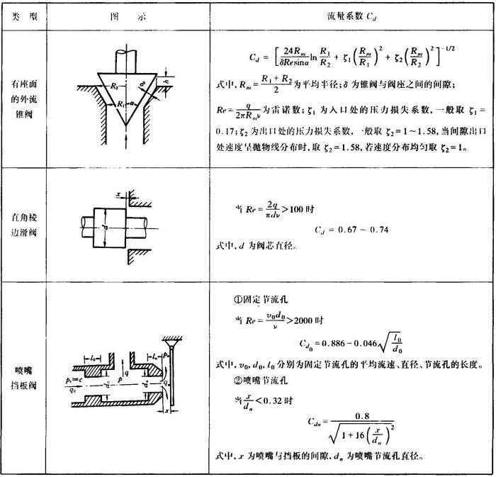 释义 | 节流公式 在液压系统中广泛地应用节流器或阻尼小孔来控制流量或压力,如图1.1-4为薄壁节流小孔的流动,它就是伯努利方程的具体应用。 (1)节流公式 对于低粘度液体通过薄壁小孔口作近似计算时,常取 Cc≈0.62~0.64 Cv≈0.97 ζ≈0.06 Cd≈0.6~0.61 (3)液压阀口的流量系数 在液压阀的设计和计算时,流量的计算就是应用节流公式(1.1-8),计算中Cd是个关键的数值。而阀的种类和形状较多,不同的液体通过不同阀口时,使阀内流动变得更复杂了。故阀的Cd不能一般而论。现将部分学者实验研究结果汇集于表1.1-3。 表1.1-3 液压阀的流量系数 |