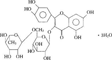 释义 | 芦丁[部] C27H30O16·3H2O=664.59 CAS-153-18-4 3,3′4′,5,7-五羟黄酮-3-芸香糖苷三水化合物。 3,3′4′,5,7-Pentahydroxyflavone-3-rutinoside trihydrate. 维生素类药。具有降低毛细管的异常通透性和脆性的作用。 主用于高血压的辅助治疗。 路丁,云香甙,路通,维生素P。 Rutin,Rutoside,Vitamin P. 芦丁片,复方芦丁片。 INN,DCF,DCIT,FP,GFP,JP,NF,NFN,USAN,USSRP,MI. |