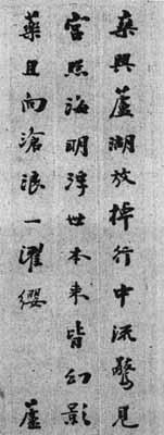 【简介】: 近代·汪荣宝书。纸本。行书。七律一首。凡四行,共六十八字。刊于《民国时期书法》(上)。 【赏析】: 汪荣宝的行书带有翁同龢的影子,浑厚中更多地留给人以温和、平静、圆润的印象。作者没有打算写成结体奇巧,造型奇特之作,整件作品似乎淡淡而来,淡淡而去。结体顺理成章,没有惊人之处。章法依格塡字,不相连属。他十分自如的进行,有一气呵成之感。这是一件创作得十分轻松的作品。作者似乎不太习惯使用长线条纵横挥洒,他更多偏爱于短线条,有时用力一顿不需挪动便可替代,由此,长捺极少出现,往往以点代之。这些短线条的堆积,有时也起到不明快的结果,显得空间拥挤。无往不收在这裏得到很好的体现。作者没有让任何一个字流露出咄咄逼人的锋芒,而尽力以外部的圆润去感染人。但过于圆润,字形又难免缺乏灵气,尤其是笔道短而粗的字,更是平淡无奇,难以引人注目。作品的精采之处是“逈”、“游”、“蓬”诸字,起了绝妙的调节作用。那一波三折,多么潇洒风流,顾盼生情,那像蹲鸱,像立鹤立于一波三折的起始处,又多么生动和有趣,寥寥几道轻盈的弧线,给通篇增加了光彩。