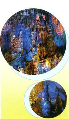 距桂林市西北郊约6公里的光明山南侧山腰上有一个洞口,两旁生长著可以做成笛子的芦草,人称芦笛洞。这是一个雄奇瑰丽的岩溶洞穴,迄今已有60多万年的历史,这就是芦笛岩,外形呈马蹄形,洞深240米,游程约500米。洞内有大量的石乳、石笋石柱、石幔和石花,在现代多彩光源的照射下,形成了许多著名景点,如狮岭朝霞、石乳罗帐、原始森林、云台揽胜、盘龙宝塔帘外云山、远望山城、幽景听笛等等,景观密集,曲折萦回,洞天高阔,气势雄奇。芦笛岩内保存著唐宋以来的壁书77则,多是墨笔所写,字迹仍可辨认。元明以后此洞成为当地人民躲灾避难之所,洞口被堵,少为人知。芦笛岩内岩溶地貌斗艳争奇,洞外则绿荫环抱,一汪清池波平如镜,境界开阔,远山如画。最妙的是可以穿上民族服装乘南方竹筏竞游,水从脚底滑过,如行天上,也是一番人在画中游的享受。