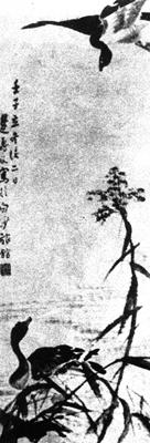 【作品赏析】: 此图生动地描绘了江苏淮安一带的苇塘小景:在芦苇丛生的沙坡间,栖息著一只朴质无华的秋雁。 此时,它正引颈仰望,热切呼唤伴侣的降临。那只盘旋在空中的大雁似已听到呼唤,正舒开翅膀徐徐地降落下来。这是多么自然而又优美的瞬间!在画法上,作者以娴熟的泼墨法挥写秋雁的躯体,仅在喙间及足部略施赭黄,既丰富了色彩变化,又与秋雁主体所用的浓淡有致的墨色达到了和谐的统一。苇芦是用枯笔以带有赭色的墨彩写成的,画得苍劲爽利,平淡天真。 同时以几笔生涩的时断时续的横墨表现苇间沙坡,淡漠广远,深得“遗貌取神”的妙趣。相传每年秋季,边寿民常常结屋荒洲,静观芦雁的飞潜动静。 因此所画芦雁皆苍浑奇逸,笔简意足。此幅在白沙旅馆画于立冬后二日的《芦雁图》,当是画家善于实地观察和写生的明证。 。【作者介绍】: 边寿民,活动于雍正、乾隆年间,具体生卒年月不详。 原名维祺,字寿民,更字颐公,号渐僧,又号苇间居士。江苏淮安人。 以诸生终其身,工书善诗,能画山水、花卉,但以擅写芦雁饮誉画史。 。  清 边寿民 轴 纸本设色 |