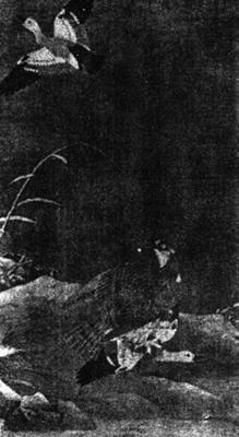 画面上呈现出一幅云水惨淡的景象:岸石和芦苇上尚留著残雪;两只食宿其间的寒雁遭到了苍鹰的意外袭击,一雁被鹰抓获,匐伏于地,作哀鸣挣扎状,另一雁展翅惊呼而去,可是贪心的苍鹰却用眼睛盯住它不放。