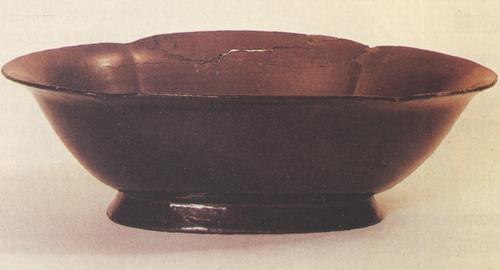 释义 | 花瓣形圈足黑漆碗 ◎食器/北宋早期 湖北监利福田寺宋墓出土 口径37.5厘米 底径21厘米 通高12厘米 木胎/湖北省荆州博物馆藏 ●此碗为花瓣形口沿,敞口外撇,腹部较深,圈足较矮且外撇。 外撇的口沿与外撇的圈足上下呼应,造型优美,且增强碗体的稳定感。从口沿残缺处可知,此碗的制作工艺为圈叠法(即将木条水浴加温、弯曲成圈、烘干定型后,一圈圈累叠,胶粘成形,然后磨平)。因各圈的接口错开,木条的应力被分散,不易变形,经久耐用,且轻薄平整。 该碗为一色漆器,通体遍髹黑褐色漆,无纹饰,给人以古朴高雅之感觉。 |
