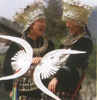 人口为8940116人。 苗族主要分布在贵州、湖南、云南、四川、广西、湖北、海南等省、(区)。在贵州省东南和湖北、湖南、贵州等省的交界地带(以湘西为主),有较大的聚居区。其他地方的苗族则与其他各民族杂居。 根据2000年第五次全国人口普查统计,苗族人口数为8940116人。 苗族使用苗语,属汉藏语系苗瑶语族苗语支。由于长达几千年的迁徙,住地分散,因而苗语逐步分成三大方言,即湘西(东部)方言、黔东(中部)方言和川黔滇(西部)方言。 此外,川黔滇方言内部又分7个次方言。1949年新中国成立以前,苗族没有统一的文字。 政府于1956年组织汉、苗语言工作者创制或改革了4种方言的拉丁拼音文字,现正普及使用。 苗族的挑花、刺绣、织锦、蜡染、剪纸、首饰制作等工艺美术,绚丽多彩。苗族的蜡染工艺,已有千年历史。苗族的传统银饰多种多样,包括手钏、项圈、头饰、胸饰、银衣等,花纹雕凿精工,享有盛名。 苗族的节日很多,各地的苗族过的节日不完全相同。黔东南部分地区和广西融水县盛行过“苗年”,在农历九至十一月的卯(兔)日或丑(牛)日举行,有踩鼓、跳芦笙、赛马、斗牛、“游方”等活动。 贵阳附近几县的苗族,每逢农历四月初八,都穿上盛装来到贵阳市喷水池附近,吹笙奏笛,对歌谈心,纪念传说中的古代英雄“亚努”。此外,苗族还有龙船节、花山节(五月初五)、吃新节(农历六、七月间稻谷成熟时)、清明节、赶秋节(立秋)等等。 云南苗族几乎每年都有踩花山的活动,是苗族人民传统性的群众娱乐节日。  苗族女子 |