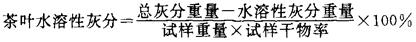 中国现行标准等效采用国际标准ISO1576-1975《茶-水溶性灰分和水不溶性灰分的测定》。检测方法是将测得的总灰分用25ml热蒸馏水,分次从坩埚中洗入100ml烧杯中,加热至微沸,趁热用无灰滤纸过滤,再用热蒸馏水分次洗涤烧杯和滤纸上的残留物,直至滤液体积达150m1为止。将滤纸连同残留物移入原坩埚,在水浴上蒸去水分,移入525±25℃炉内灼烧至灰中无碳粒(约1h),以下操作方法同总灰分检验。用下式计算其含量。