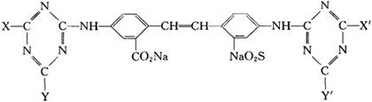 释义 | 荧光增白剂VBL 阴离子型化合物。 化学组成二苯乙烯双三嗪型衍生物。结构式: 为淡黄色粉末,荧光色绸青光微紫。 不宜于阳离子染料,真丝洋纺增白用0.3~0.4g/L,用量不宜过多,过量时白度反而降低,甚至泛黄。 |