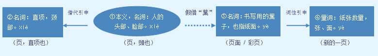 字源解说 页,甲骨文 = (首,头部)+ (人),表示人的头。造字本义:人的头部、脸部。金文 将甲骨文的 写成 ,将甲骨文的 写成 。篆文 将金文的“首” 写成 。隶书 将篆文的“人” 写成两点 。注:“页”假借“葉”之后,“页”不读它原有读音 xiÉ ,而转读被假借字“葉”的读音 yÈ ,这是合并或假借过程发生的“变读”现象。 附 文言版《説文解字》:頁,頭也。从 ,从儿。古文 如此。凡頁之屬皆从頁。 者, 首字也。 附 白话版《说文解字》:页,人的头部。字形采用“ 、儿”会义。古文“ 首”的“首”写成这样。所有与页相关的字都采用“页”作边旁。 ,也是“ ”的首字。 引申线索