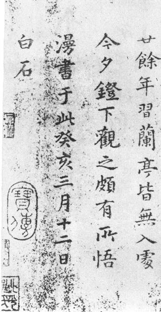 【集评】: 宋谢采《续书谱序》:“白石生好学,无所不通。书法得魏、晋古法,运笔遒劲,波澜老成。尤好临习《定武本兰亭序》,所著《续书谱》一卷,议论精到,用志刻苦。”明陶宗仪《书史会要》:“姜白石书法逈脱脂粉,一洗尘俗。” 【赏析】: 姜白石精于书法,有《续书谱》传世,爲书学史上重要理论著述。此跋虽寥寥数行,而楷书运笔遒劲,自首至尾无一笔松懈,故观者若放大十数倍亦当有波澜益壮之感。学晋人书,笔笔送到,点画皆可独立,而坚实淳静,脱尽尘俗,淸气盎然,实不可多得。赵孟坚推爲“书家申韩”盖有以也。 |